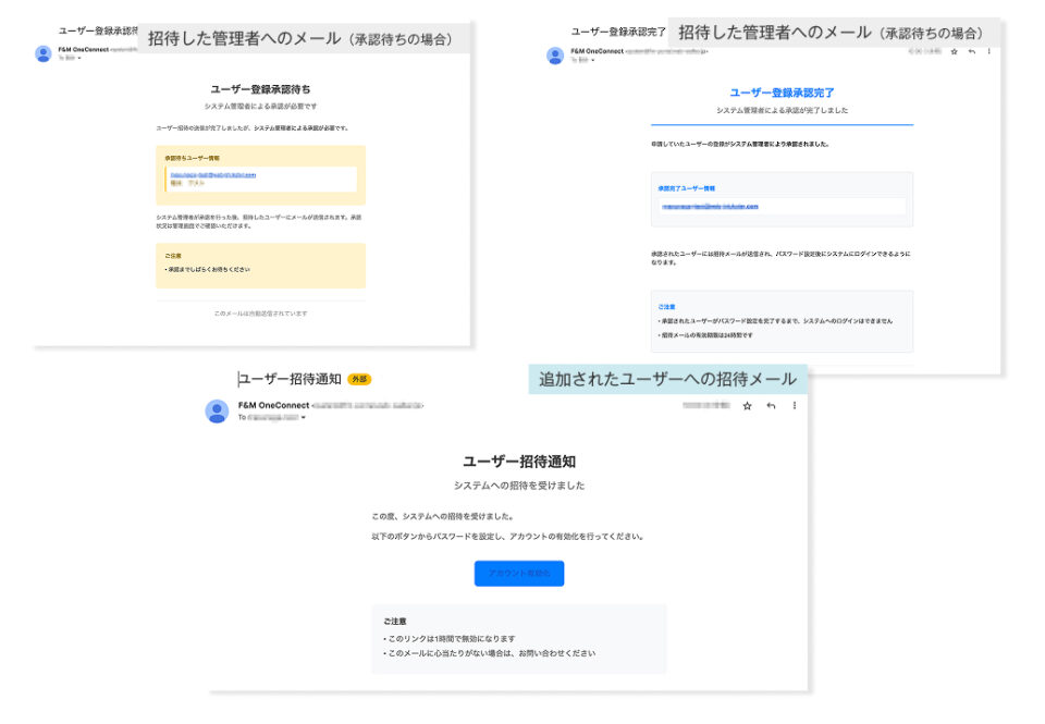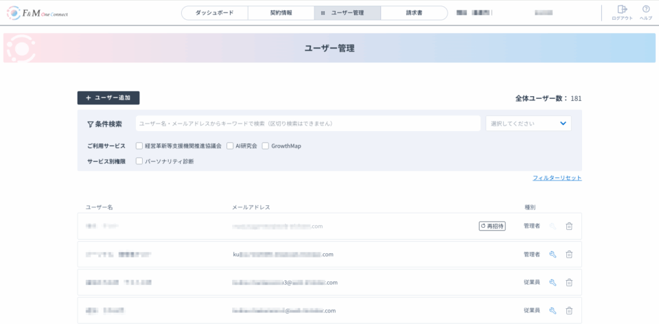 F&M One Connectのユーザー管理画面にて、対象ユーザーの横にある「再招待」ボタンをクリックすると、対象ユーザーに再度招待通知メールが送信されます。
