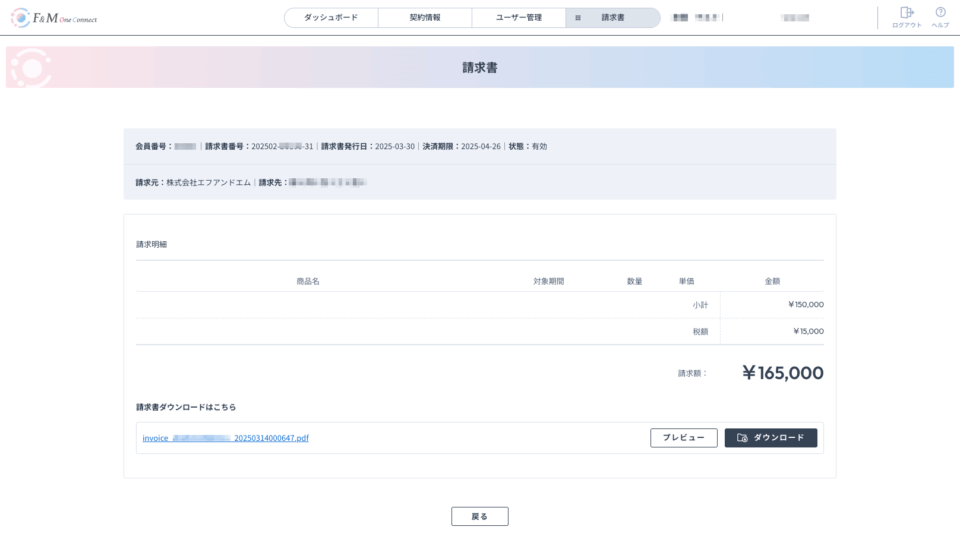 ご請求内容がご確認いただけます。プレビューで確認や、ダウンロードも可能です。